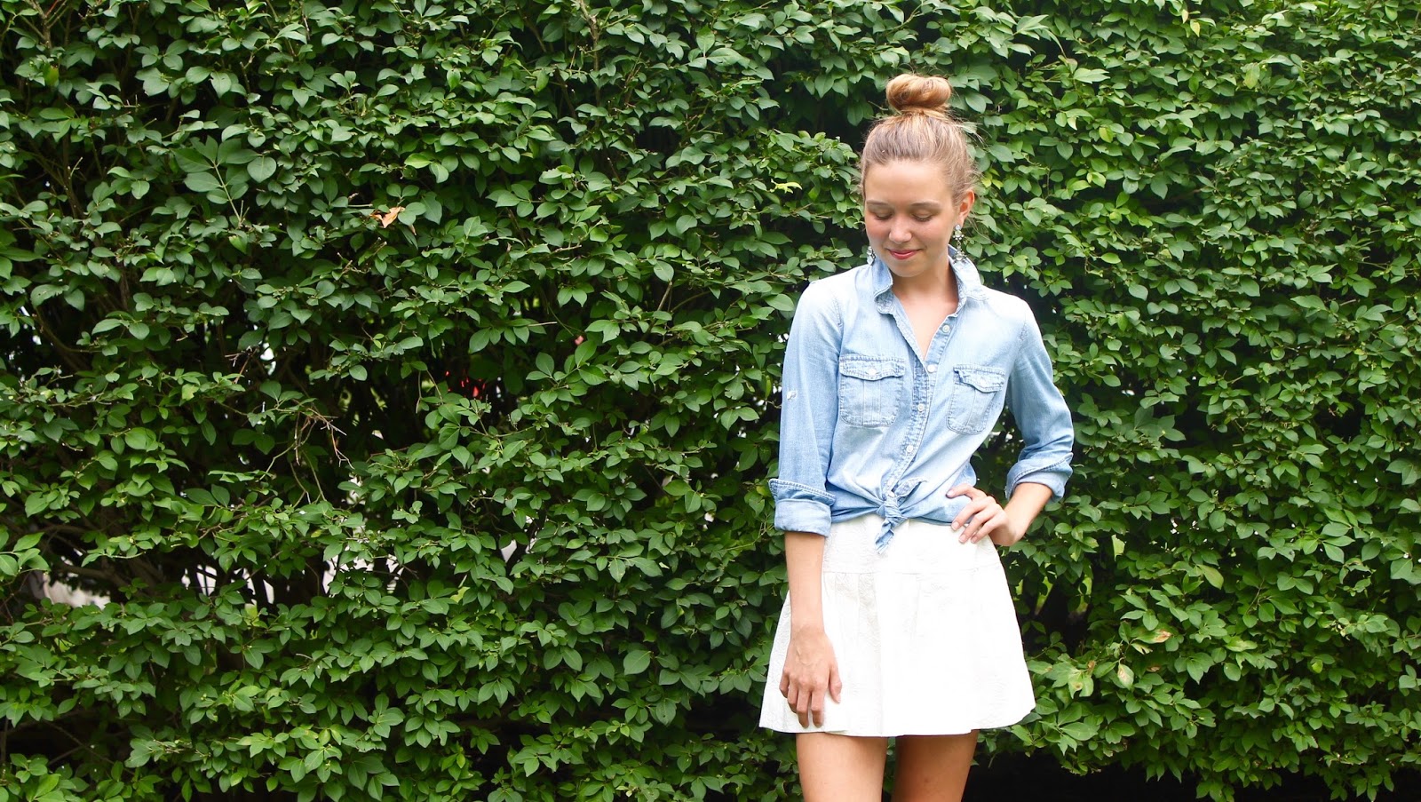 I decided to keep my outfit simple and chic today. Despite the humid weather, I threw on my long sleeve J.Crew chambray shirt and jacquard flounce skirt. I went with simple taupe wedges to complete the look!